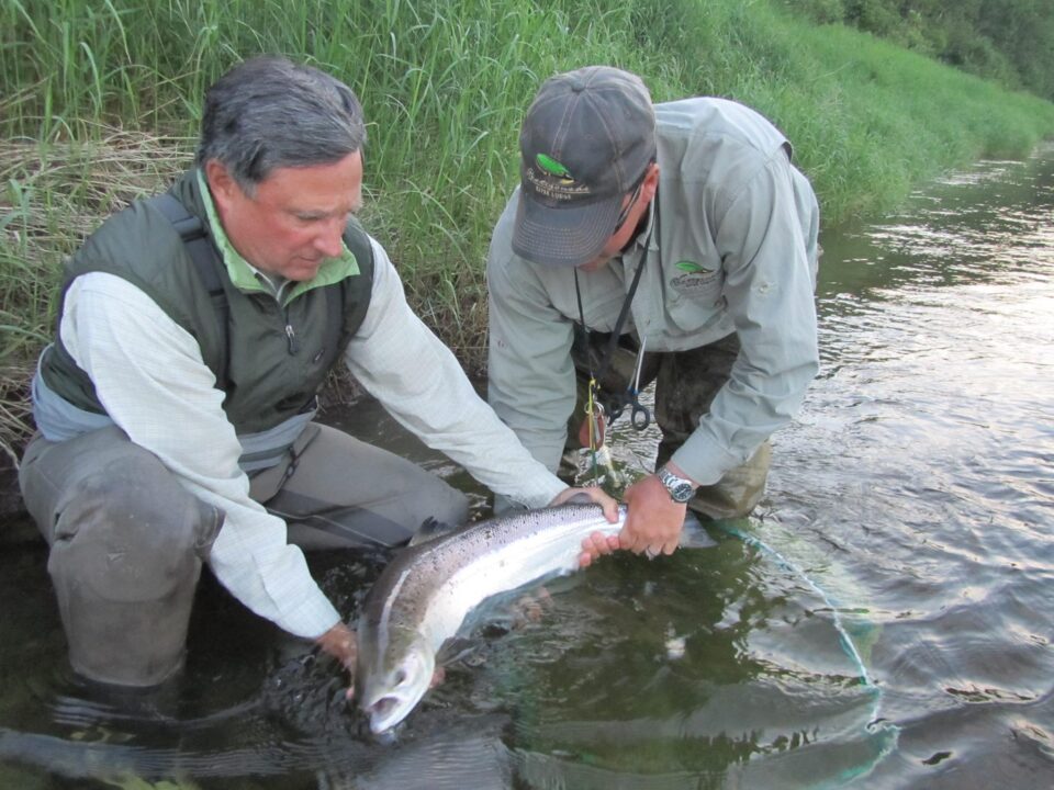 RRL guest Tom Moore from the state of Texas landed a 25lb salmon in home pool on his recent trip to the lodge. Shown here is RRL guide Matt with Tom’s fish.